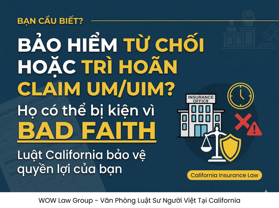 Nếu hãng bảo hiểm từ chối hoặc trì hoãn claim UM/UIM một cách không hợp lý, họ có thể bị kiện vì bad faith (vi phạm nghĩa vụ thiện chí). Luật California bảo vệ quyền của bạn trong trường hợp này.